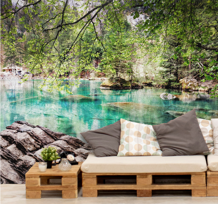 Uživajte u predivnom dizajnu Foto tapete mirna scena jezera koji donosi mir i harmoniju u svaki prostor. Ova fototapeta prikazuje slikovitu scenu jezera okruženog bujnim drvećem i stablima, stvarajući savršeni prikaz prirode. Krajolik je ispunjen zrcalnom vodom i stjenovitim obalama koje dodatno naglašavaju ljepotu šume. Ovaj vizualni doživljaj unosi toplinu i spokoj u vaš dom.