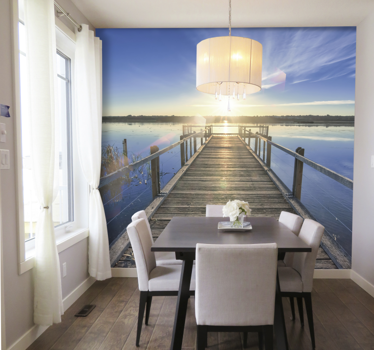 Uživajte u prekrasnom ambijentu s našom foto tapetom prikaz zalaska sunca s mola. Ova očaravajuća tapeta donosi 3D efekt koji će vašem prostoru dati dubinu i živost. Plavo nebo se savršeno stapa s drvenim molem, dok mirna voda reflektira zalazak sunca u najljepšim nijansama. Dajte svom interijeru miran i spokojan ugođaj koji će vas svakodnevno inspirirati!