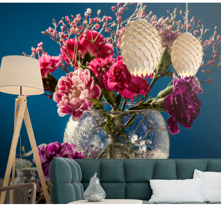 Uživajte u raskoši prirode s našom Foto tapete cvijet Živopisna cvjetna kompozicija. Ovaj predivan dizajn obogaćen je elementima poput češnja, stakla i cvijeća, dok karanfili i flora stvaraju impresivnu kompoziciju u vazi. Kapljice koje se prelijevaju kroz ovaj umjetnički prikaz dodatno naglašavaju eleganciju i svježinu svakog prostora.