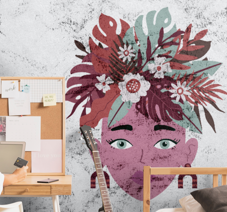 Uživajte u jedinstvenom vizualnom doživljaju s našim Foto tapetama ljudi s stiliziranim cvjetnim glavama. Ovaj grafički dizajn prikazuje portret žene s prekrasnim cvjetnim detaljima koji dodaju tropsku notu svakom prostoru. Lice obasjano cvijećem i lišćem čini ovu tapetu savršeno rješenje za sve koji traže da unesu svježinu i kreativnost u svoj dom.