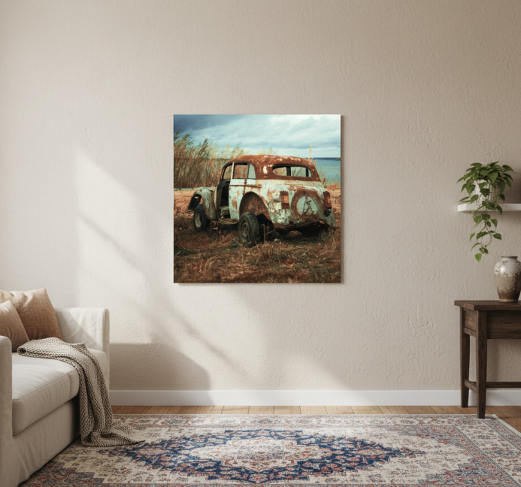 Poster dnevna soba stari prljavi auto na polju