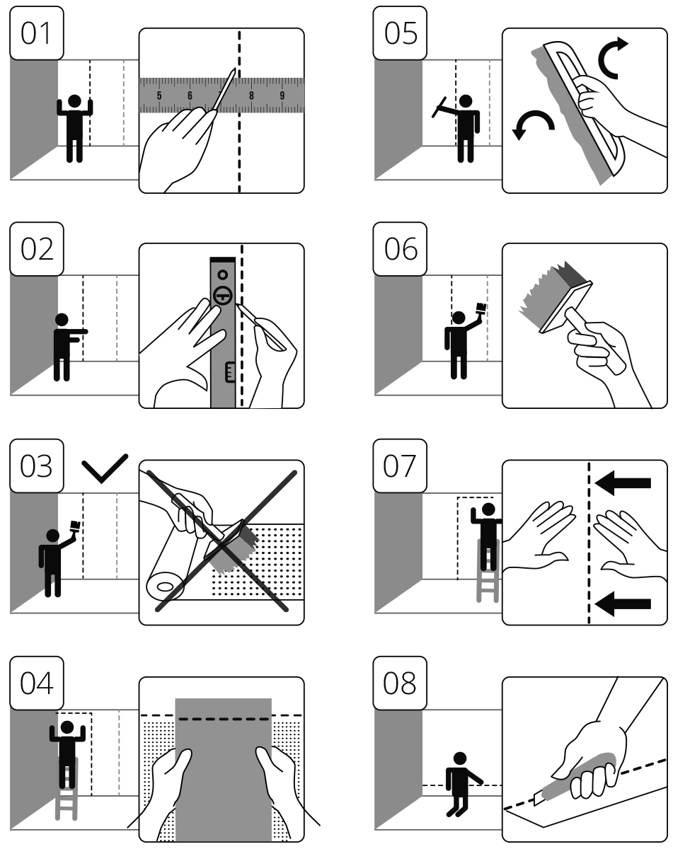 * Zbog procesa sušenja ljepila, ne preporučuje se nanošenje tapeta u sobama s niskom vlagom i temperaturama manjima od 10°C. Optimalna sobna temperatura za vrijeme nanošenja i sušenja je između 18 i 21°C