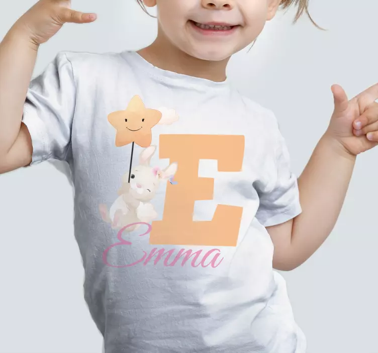 Referenca: T4701Ovaj šarmantni dizajn prikazuje veselog zeca koji drži balon u obliku zvijezde, uz slovo 'E' i personalizirano ime. Savršeno za posebne prigode, zrači radošću i razigranošću, čineći ga idealnim izborom za mališane.