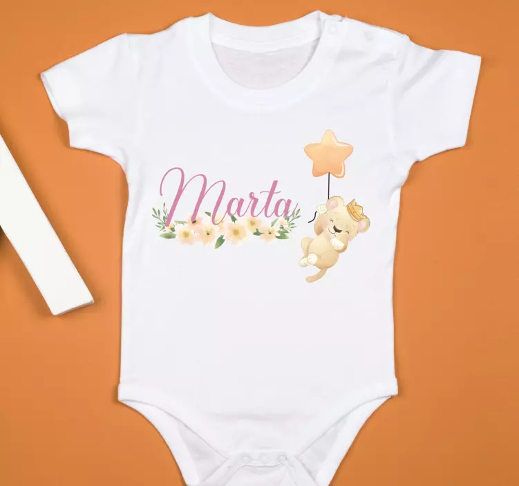 Referenca: T5219Ovaj šarmantni dizajn prikazuje slatkog medvjedića koji drži balon u obliku zvijezde, uz dodatak delikatnih cvjetnih elemenata. Ime 'Marta' elegantno je integrirano u umjetničko djelo, stvarajući veseli i personalizirani dodir savršen za odjeću za bebe.