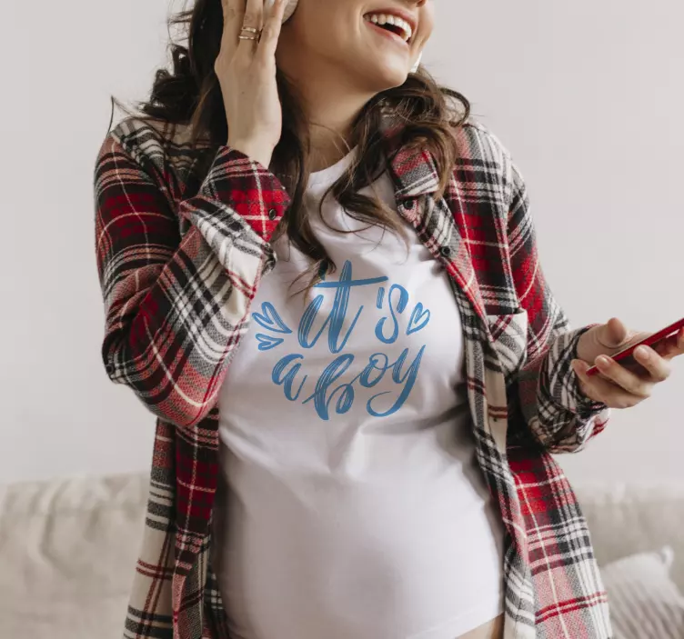 Referenca: T4442Ova slika prikazuje radosnu majku koja drži telefon dok nosi posebnu majicu za trudnice koja izražava uzbuđenje zbog dolaska bebe. Veseli dizajn ističe frazu 'It's a boy' u modernom fontu, što ga čini savršenim za proslavu otkrivanja spola ili važnih trenutaka u trudnoći.
