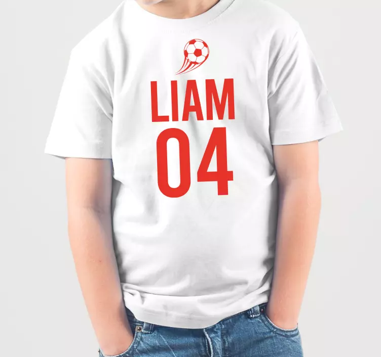 Referenca: T4113Ovaj dizajn ima živahnu temu nogometa, ističući ime 'Liam' uz broj '04'. Boje su upečatljive s odvažnim crvenim tonovima u kontrastu s bijelom pozadinom, savršeno za mlade ljubitelje nogometa.