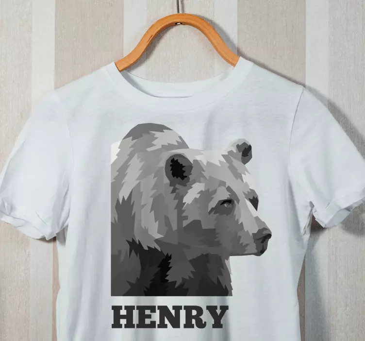 Referenca: T4983Ovaj dizajn prikazuje medvjeda prikazanog u geometrijskom stilu, pružajući jedinstvenu reprezentaciju. Ime 'Henry' prati životinju, stvarajući personalizirani dodir. Sive nijanse dodaju suvremeni element, čineći ga privlačnim širokoj publici.
