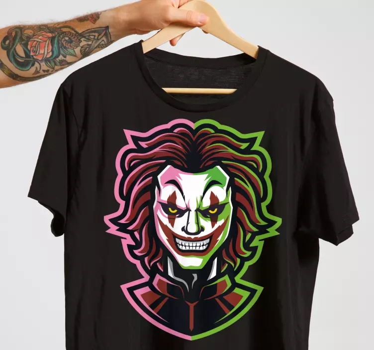 Referenca: T4710Ovaj dizajn prikazuje upečatljivog i zastrašujućeg klauna, naglašenog živopisnim bojama i prijetećim izrazom lica. Idealno za Halloween, spaja elemente horora s jedinstvenim grafičkim stilom, čineći ga istaknutim komadom za one koji vole spooky sezonu.