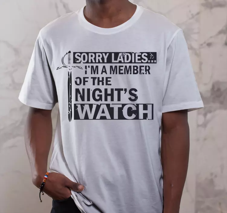 Referenca: T4932Ova bijela majica sadrži hrabru izjavu koja naglašava članstvo u "night's watch", uparen s upečatljivom grafikom mača. Savršena za one koji žele na humorističan način pokazati svoju ljubav prema fandomu dok uživaju u udobnoj ležernoj odjeći.