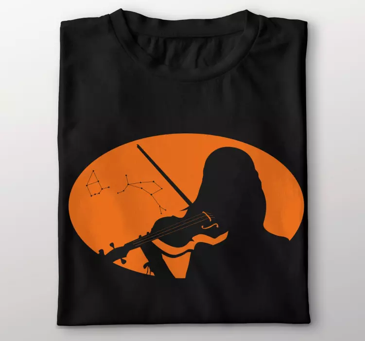 Referenca: T4530Ovaj upečatljiv dizajn prikazuje siluetu violinista ispod zvjezdanog neba s konstelacijama u pozadini. Živahna narančasta kružnica prekrasno kontrastira s crnom tkaninom, čineći je savršenim izborom za ljubitelje glazbe. Idealno za posebne prigode ili ležernu odjeću.