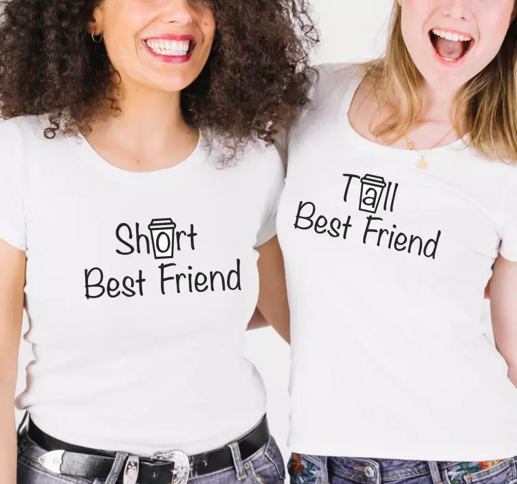 Referenca: T4553Ova slika prikazuje dva prijatelja u usklađenim majicama koje na humorističan način označavaju njihove visine. Jedna majica kaže 'Short Best Friend', dok druga kaže 'Tall Best Friend'. Igrački tekst naglašava njihovo prijateljstvo i povezanost.