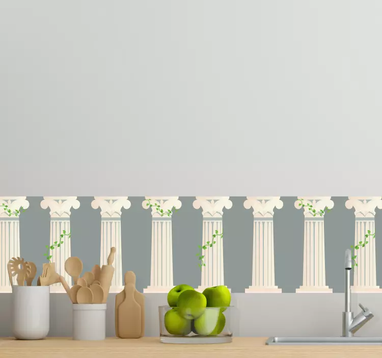 Naša Bordura za zid klasični stupni naglasak donosi elegantan dodir grčkog dizajna u vaš interijer. Ovaj proizvod, inspiriran klasičnim stupcima i vinovom lozom, savršeno se uklapa u suvremene kuhinje, stvarajući jedinstvenu atmosferu koja očarava. Njegov sofisticirani izgled može dodati poseban naglasak bilo kojem prostoru, ističući stil i harmoniju u vašem domu.