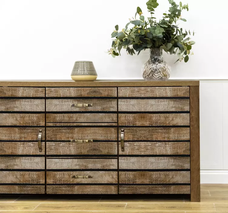 Naljepnica za pokrivanje namještaja s realističnom teksturom drveta. Detalji površine daju rustikalni, smeđkasti, starinski i grub izgled.