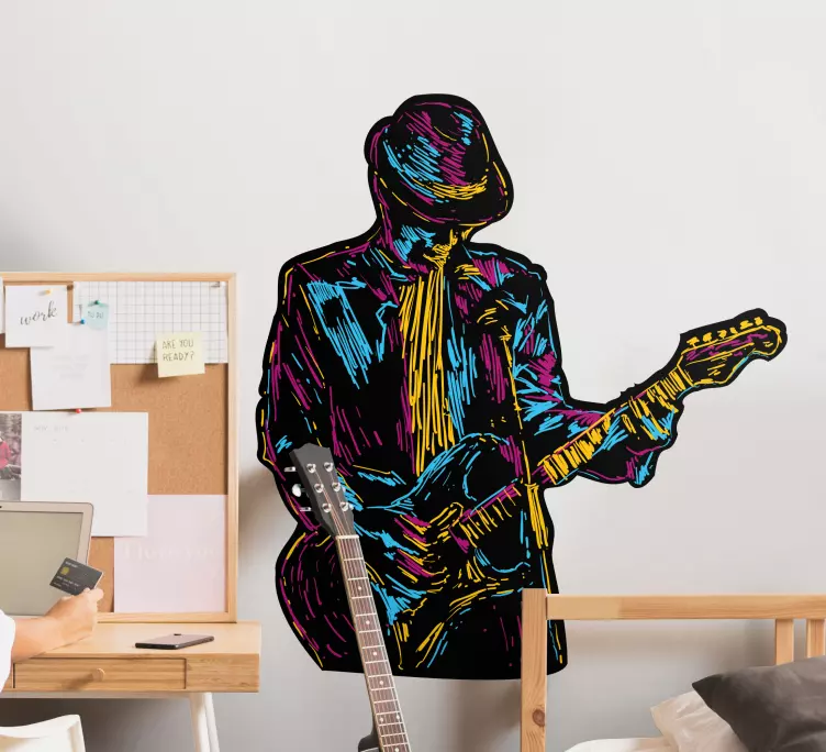 Glazbena naljepnica Glazbena naljepnica Šarena silueta gitarista idealan je izbor za svakoga tko želi unijeti dašak kreativnosti u svoj prostor. Ova naljepnica ne samo da krasi zidove, već i stvara jedinstvenu atmosferu koja potiče maštu i strast prema glazbi. Sa svojom živopisnom paletom boja, može osvježiti svaki kutak, bilo da se radi o dnevnom boravku, radnoj sobi ili glazbenom studiju. Prikazivanje gitarista u akciji donosi energiju koja će vas svakodnevno inspirirati i podsjećati na ljubav prema muzici.