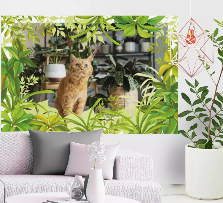Referenca: A48313Šarmantna scena koja prikazuje pažljivu mačku okruženu bujnim zelenilom. Dizajn dočarava suštinu prirode isprepletene s udobnošću doma, prikazujući mačkin radoznao karakter među raznim sobnim biljkama.