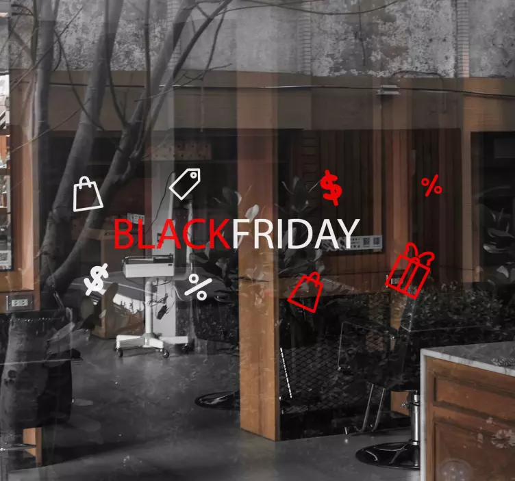 Ova prekrasna naljepnica za crni petak sadrži tekst 'crni petak' okružena raznim ikonama, uključujući torbe za kupovinu, znakove postotka, poklone i znakove dolara. Naljepnica je obojena u bijelu i crvenu kako bi pokazala koliko je dobra prodaja!
