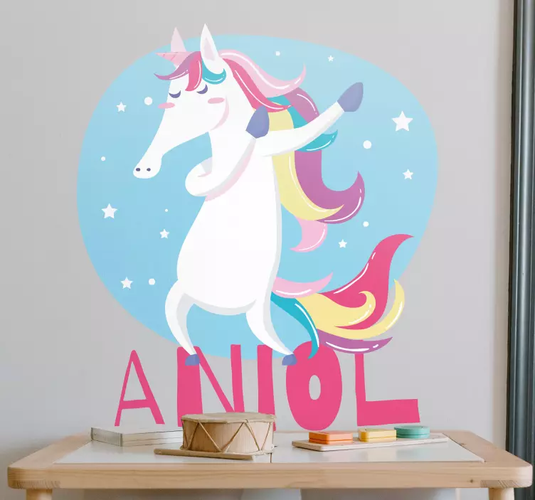 Referenca: A47669Vibrantni jednorog veselo pleše protiv umirujuće plave pozadine, okružen zvijezdama. Ovaj dizajn hvata maštoviti duh djetinjstva i mašte, čineći ga divnim izborom za osobne prostore. Proizvod se može personalizirati kako bi dodao jedinstveni dodir.