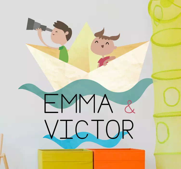 Uživajte u razigranoj dječjoj avanturi s našom prekrasnom naljepnicom za djecu! Ovaj jedinstveni dizajn kombinira elemente poput papirnog čamca i djece koja istražuju svijet oko sebe. Svaka naljepnica je prilagodljiva i može sadržavati imena vaših mališana, čineći svaki komad posebnom uspomenom. Savršena je za poticanje mašte i zabave, dok istovremeno ukrašava prostor!