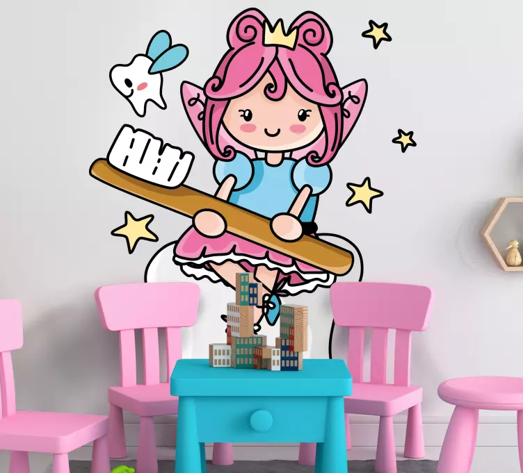 Naljepnica za djecu s likom zubne vile donosi razigran i fantazijski dizajn u dječju sobu. Ova slatka naljepnica prikazuje nasmiješenu zubnu vilu koja drži četkicu za zube u šarenoj atmosferi ružičaste boje. Ovaj grafički prikaz stvara veselu i poticajnu atmosferu, potičući dječju maštu i ljubav prema higijeni zuba!