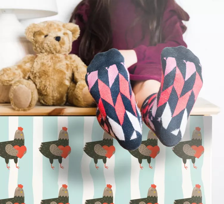 Uživajte u šarmantnom dizajnu naše naljepnice životinjama s šarmantnim uzorkom pilića, koja donosi veselu atmosferu u svaki prostor! Ova jedinstvena naljepnica obiluje motivima pijetla, pijetlova, srca, pruga i drugih slatkih životinjskih uzoraka. Uživajte u šarenilu koje će vašem namještaju dodati dašak farme i prirode, stvarajući ugodan ambijent pun životne radosti!