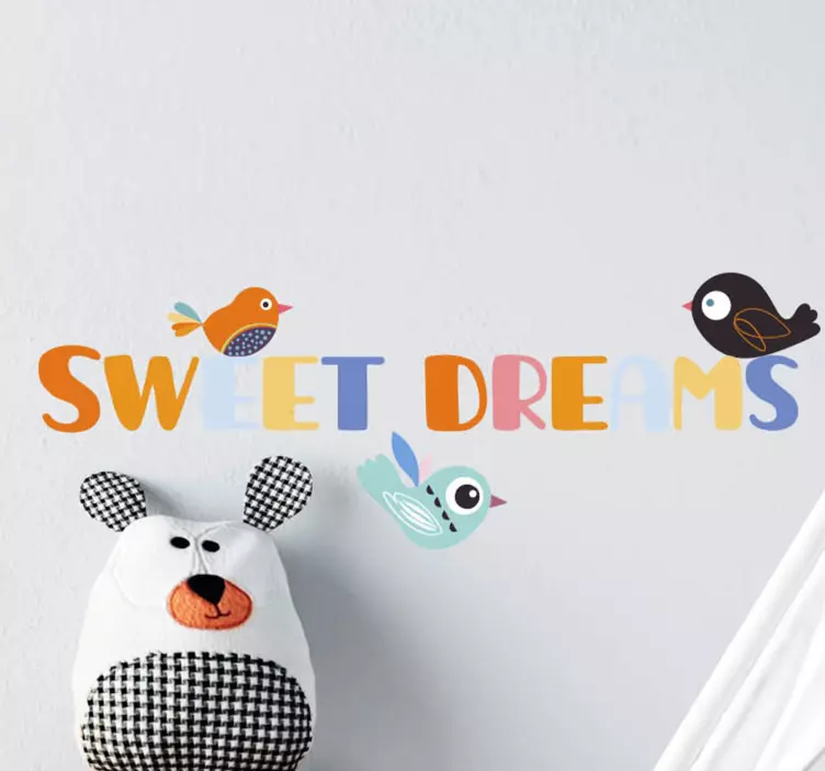 Uživajte u čarobnom svijetu snova s našim Naljepnicama uzglavlje Šarena noćna fraza, koje donose razigran i slatkast dizajn. Ove naljepnice s ilustracijama ptica i šarenim slovima savršene su za dječje sobe, stvarajući atmosferu maštovitih snova. Višebojni motivi i slatki tekstovi upotpunjuju prostor, dodajući dašak veselja i kreativnosti.