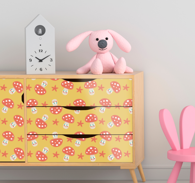 Uživajte u čaroliji našeg grafičkog dizajna s naljepnicama za namještaj s uzorkom gljiva, koje donose razigranost u svaki prostor! Ove prekrasne naljepnice, s motivima muharica i zvijezda na veseloj žutoj pozadini, savršeno će obogatiti dječji dekor. Uz njih, vaš namještaj će dobiti kapriciozan i živahni izgled, idealan za stvaranje zaigrane atmosfere u svakom kutku doma.