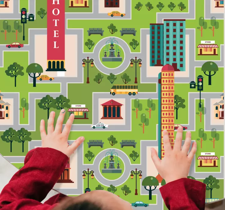 Referenca: A49463Živopisna gradska karta koja sadrži složene detalje poput zgrada, drveća, trgovina i vozila. Prikazuje razne znamenitosti, uključujući "a hotel" i "a fountain", potičući maštovitu igru i istraživanje za djecu, stvarajući zanimljivo i interaktivno iskustvo.
