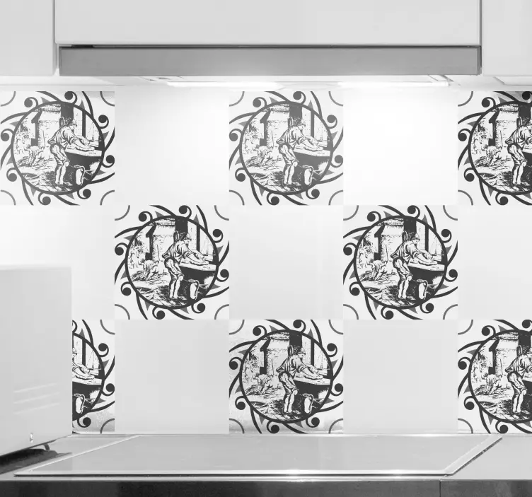 Referenca: A52160Ovaj dizajn prikazuje vintage zanatsku scenu, prikazujući majstora koji marljivo radi za stolom, okružen zavojitim dekorativnim elementima. Složenih detalja koji evociraju osjećaj nostalgije i umjetnosti, čini ga privlačnim dodatkom svakoj prostoriji.