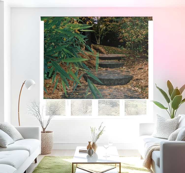 Ovaj dizajn ima detaljan šumski hodnik s kamenim stepenicama koji ima žuto cvijeće. Ovaj šumski krajolik s kamenim stepenicama i cvjetnim roletama za dnevni boravak koji mogu biti vaši u različitim veličinama.