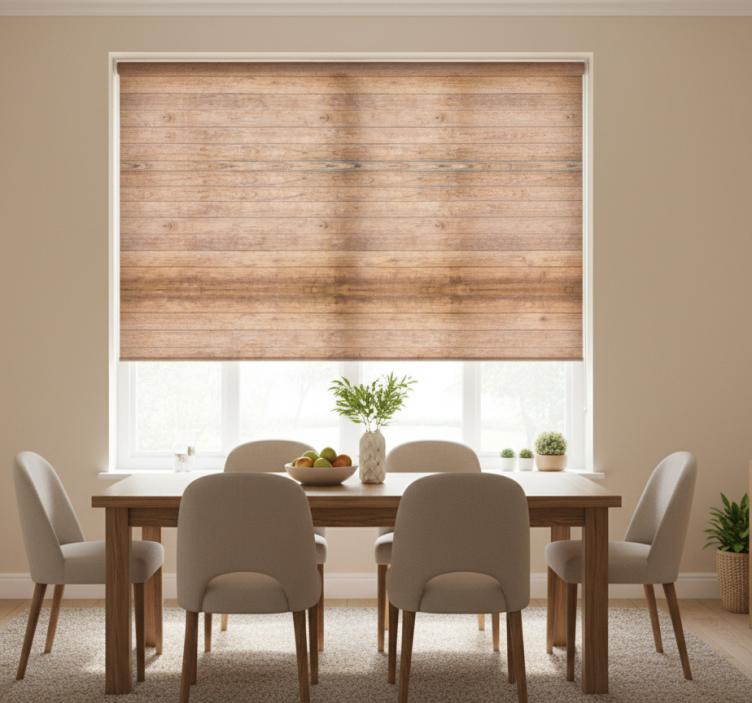 Rolo zavjese blagovaonica u horizontalnom rustikalnom drvu