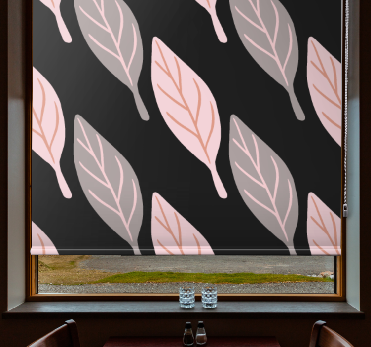 Rolo zavjese crna pozadina s ružičastim i sivim lišćem.