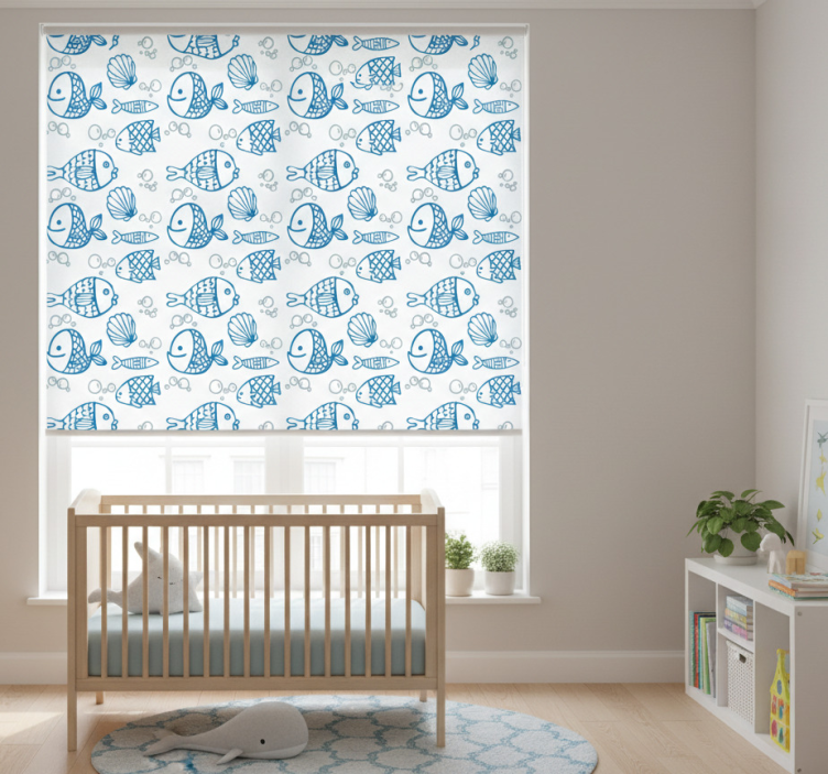 Zavjese za dječju sobu s plavim ribicama na bijeloj podlozi