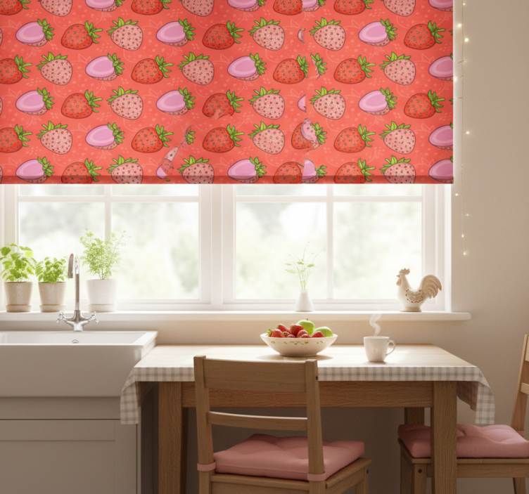 Zavjese za kuhinju s uzorkom jagoda u crvenoj i ružičastoj