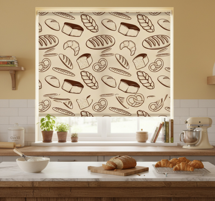 Zavjese za kuhinju s uzorkom pekarskih elemenata