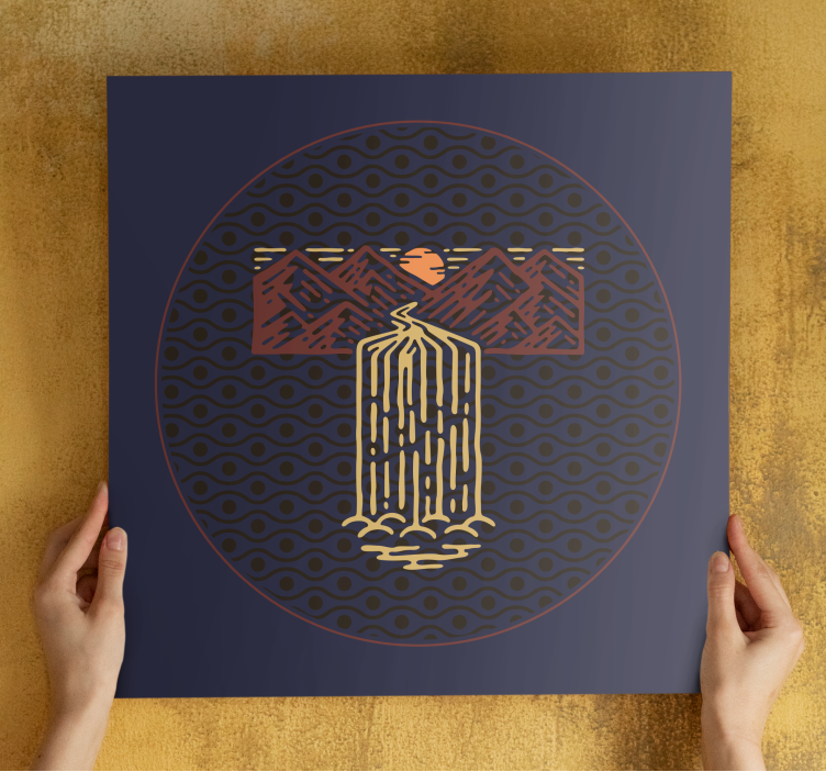 Referenca: Q7828Umirujuća kompozicija koja prikazuje vodopad kako se slijeva između stiliziranih planinskih vrhova i zalazećeg sunca. Kružni dizajn dodaje harmoniju, dok složene linije izazivaju osjećaj spokojstva i povezanosti s prirodnim svijetom.