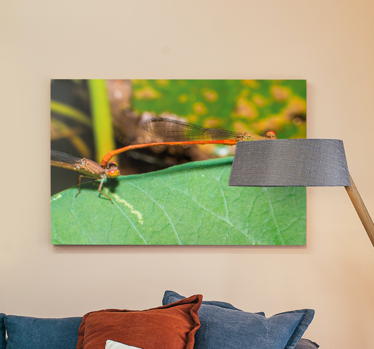 Uživajte u predivnom vizualnom doživljaju s našom Slika na platnu vilin konjic koja prikazuje par vilin konjica u svom prirodnom okruženju. Ova jedinstvena fotografija obuhvaća sve čarobne detalje prirode, poput zelenog lišća i prekrasnih kukaca. S pažnjom izrađenim dizajnom, ova slika donosi miris svježeg zraka i ljepotu otvorenog prostora u vaš dom.
