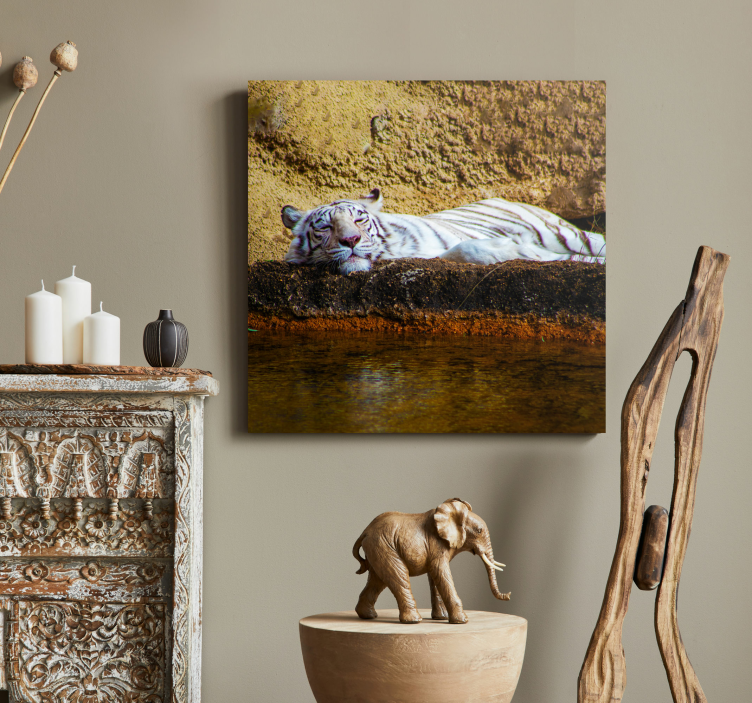 Referenca: Q6655Mirna scena prikazuje bijelog tigra koji se odmara uz vodu, pokazujući svoj smiren stav. Tiger leži na teksturiranoj pozadini, ističući svoje karakteristične pruge i miran izraz, okružen prirodnim elementima koji dodatno obogaćuju prizor.