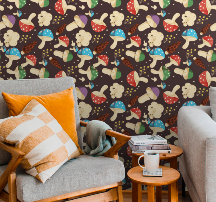 Višebojna tapeta s uzorkom gljiva je lijepa, šarena i preobrazila bi izgled kuhinje, spavaće sobe ili blagovaonice.